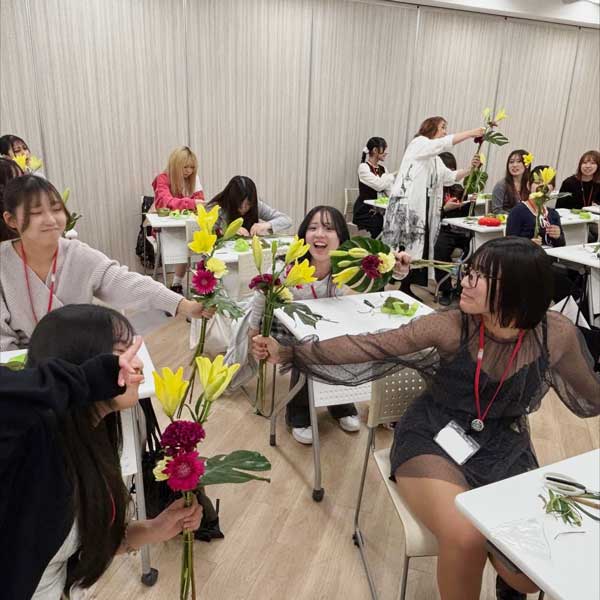 授業では、ただ花を束ねるだけではなく、